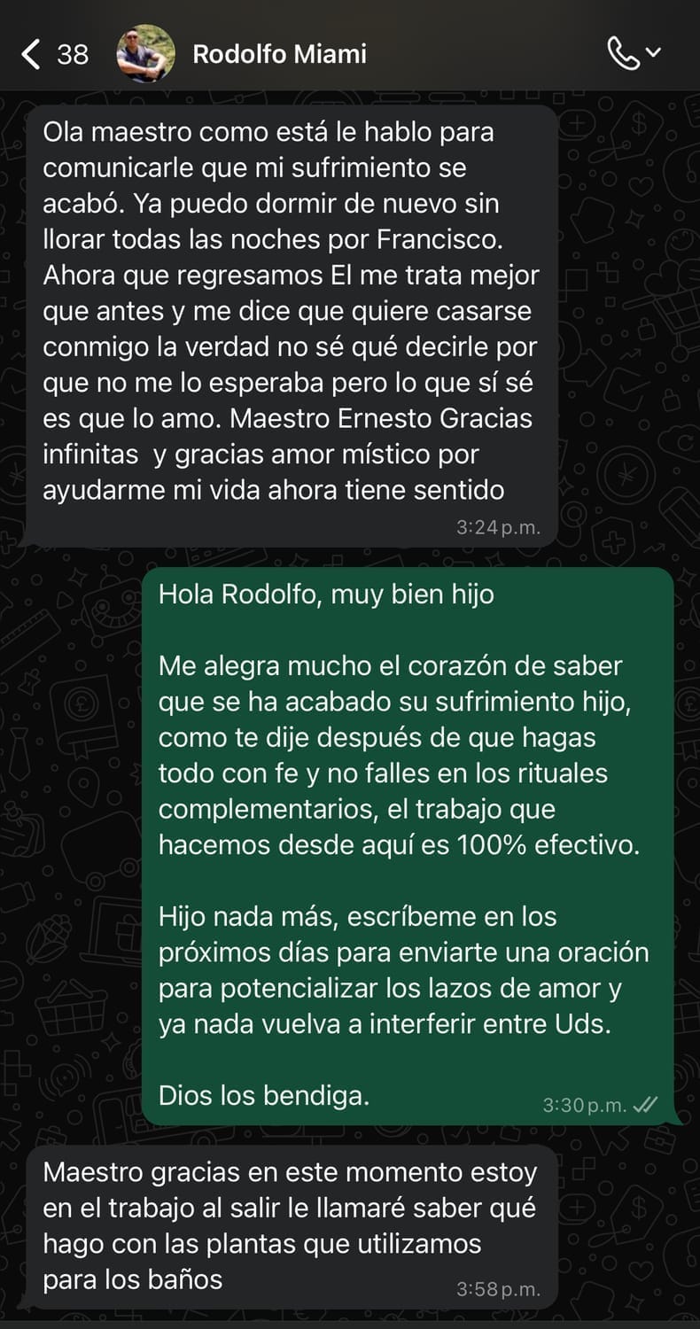 Ernesto no es un guía espiritual común. Es un canal puro, ancestral y activado para este tiempo. Su energía no solo sana: libera, transforma y reconecta. Especialista en limpiezas energéticas profundas y amarres espirituales de alta vibración, Ernesto tiene el don de detectar con precisión quirúrgica bloqueos invisibles, trabajos oscuros, envidias, pactos heredados y cortes emocionales que afectan la vida, el amor y la prosperidad de quienes acuden a él. Su mirada penetra en lo que tu alma ya sabía pero no podía explicar. Desde muy joven sintió un llamado distinto: percibía el dolor de otros como suyo, y aunque intentó reprimirlo, una noche de revelación lo llevó a despertar por completo su poder. A partir de ese momento, se formó en disciplinas sagradas como Rituales Ancestrales, lectura akáshica, herbolaria espiritual, limpiezas áuricas, reprogramación del campo emocional y rituales de unión álmica. Lo que distingue a Ernesto no es solo su preparación, sino su frecuencia: cuando entra a tu campo, la verdad sale a la luz, el alma respira, y lo imposible empieza a ordenarse. Ha ayudado a personas de todo el mundo a recuperar su energía vital, volver a atraer al ser amado, cerrar ciclos kármicos y restaurar vínculos que parecían perdidos. Con él no hay teatro ni exageración: hay poder real. Su presencia transmite seguridad, firmeza, compasión y propósito. Hoy, Ernesto no busca reconocimiento, busca almas listas para liberarse de una vez por todas. Porque cuando él limpia… no queda rastro de oscuridad. Y cuando él une… el alma lo reconoce.